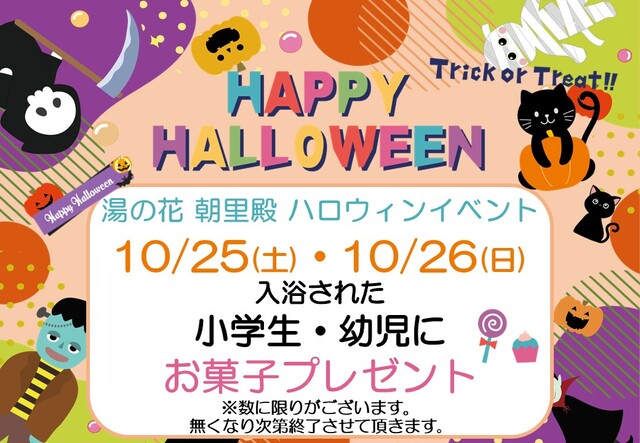 朝里殿からのお知らせ 朝里殿 10月25日と26日 ハロウィンイベント 2025年9月26日 10月の朝里殿では25日と26日にハロウィンイベント 入浴された小学生と幼児にはお菓子をプレゼント!! ※数に限りがございます。無くなり次第終了させて頂きます。