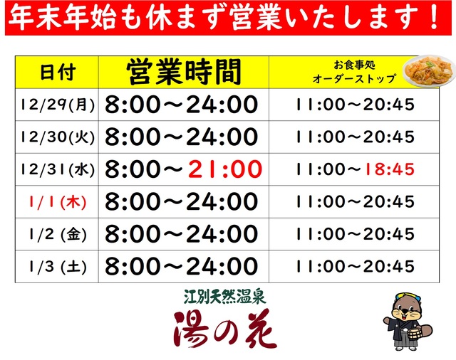 江別殿からのお知らせ 年末年始営業時間のご案内 2025年12月4日 年末年始営業時間のご案内 12月31日(水)は21:00閉館となります。 また、2階お食事処は18:45でオーダーストップになります。 年末年始も休まず営業いたします!