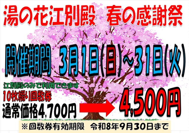 江別殿からのお知らせ 湯の花江別殿春の感謝祭 2026年2月19日 湯の花江別殿では3月1日~31日までの期間、江別殿限定 で使える回数券10枚綴り通常4,700円を4,500円で 販売致します。※回数券の有効期限は令和8年9月30日までとなっております。