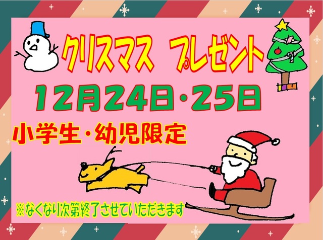 12月24日、25日は小学生以下のお子様へ クリスマスプレゼントをご用意しております。 ※無くなり次第終了とさせていただきます。
