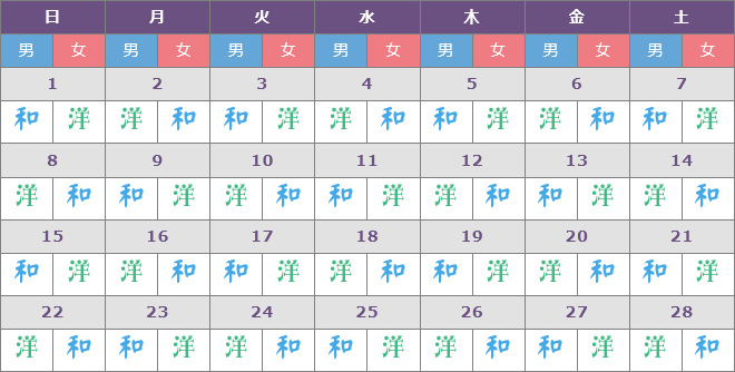 お風呂カレンダー 2026年2月 和風風呂と洋風風呂、日替わりで楽しめます。 次の月→ 諸事情により急遽変更になる場合があります。 詳しくは 電話 :011-385-4444 までお問い合わせください。
