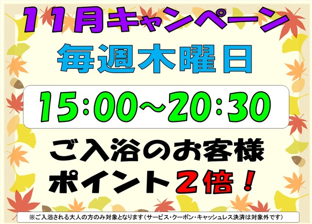 定山渓殿からのお知らせ 11月キャンペーン♪ 2025年10月17日 11月の毎週木曜日、15:00~20:30 ご入浴のお客様スタンプ2倍! ※ご入浴される大人の方のみ対象となります (サービス・クーポン・キャッシュレス決済は対象外です)