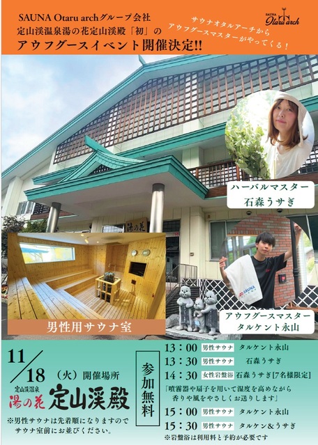 11月18日(火)、湯の花定山渓殿にてサウナオタルアーチによる「アウフグースイベント」を開催いたします!