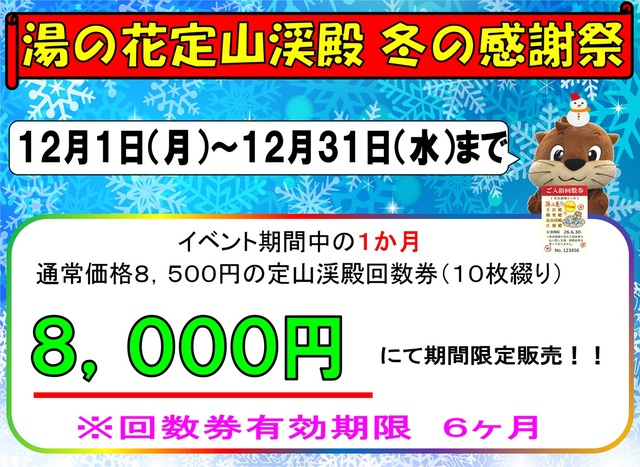 定山渓殿からのお知らせ 定山渓殿 冬の感謝祭♪ 2025年11月20日 12月1日(月)~12月31日(水)の期間中 回数券(10枚綴り)通常価格8,500円を 期間限定で8,000円にて販売致します! この機会に是非お買い求めください♪