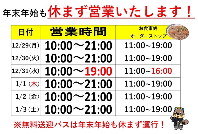 定山渓殿からのお知らせ 年末年始 営業時間のお知らせ 2025年11月19日 12月31日(水)は19:00閉館となります。 また、2階お食事処は16:00オーダーストップになります。 年末年始も休まず営業いたします!