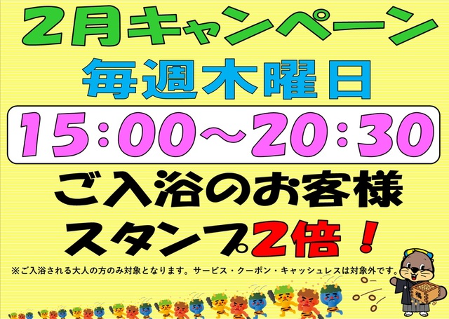 定山渓殿からのお知らせ 2月キャンペーン♪ 2026年1月16日 2月の毎週木曜日、15:00~20:30 ご入浴のお客様スタンプ2倍! ※ご入浴される大人の方のみ対象となります (サービス・クーポン・キャッシュレス決済は対象外です)