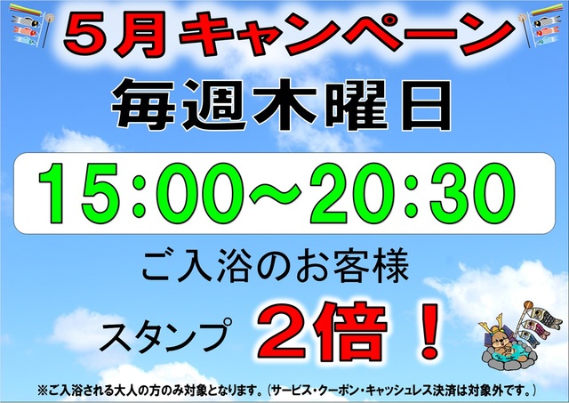 定山渓殿からのお知らせ 5月キャンペーン♪ 2026年4月15日 5月の毎週木曜日、15:00~20:30 ご入浴のお客様スタンプ2倍! ※ご入浴される大人の方のみ対象となります (サービス・クーポン・キャッシュレス決済は対象外です)