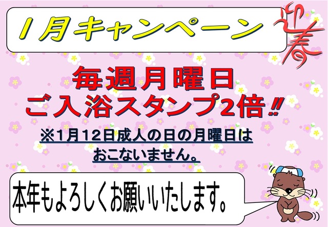 1月は 毎週月曜日 ご入浴スタンプ2倍\(^o^)/ ※1月12日(成人の日)の月曜日はおこないません