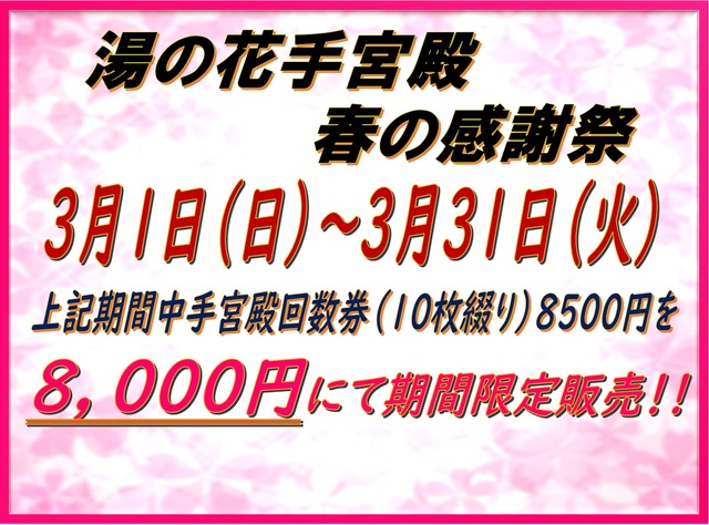 3月1日(日)~3月31日(火) 入浴回数券10枚綴り8500円を 8,000円にて販売致します。 この機会に是非お買い求めください。